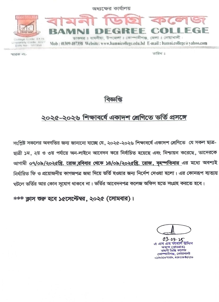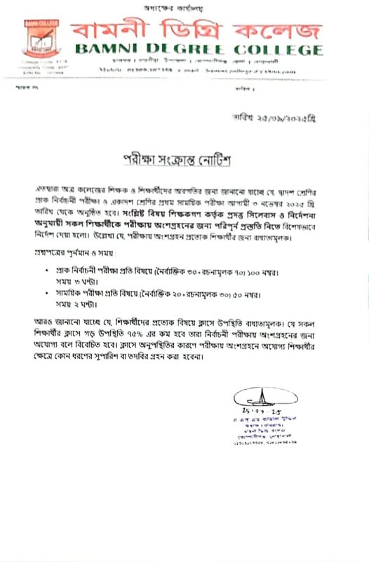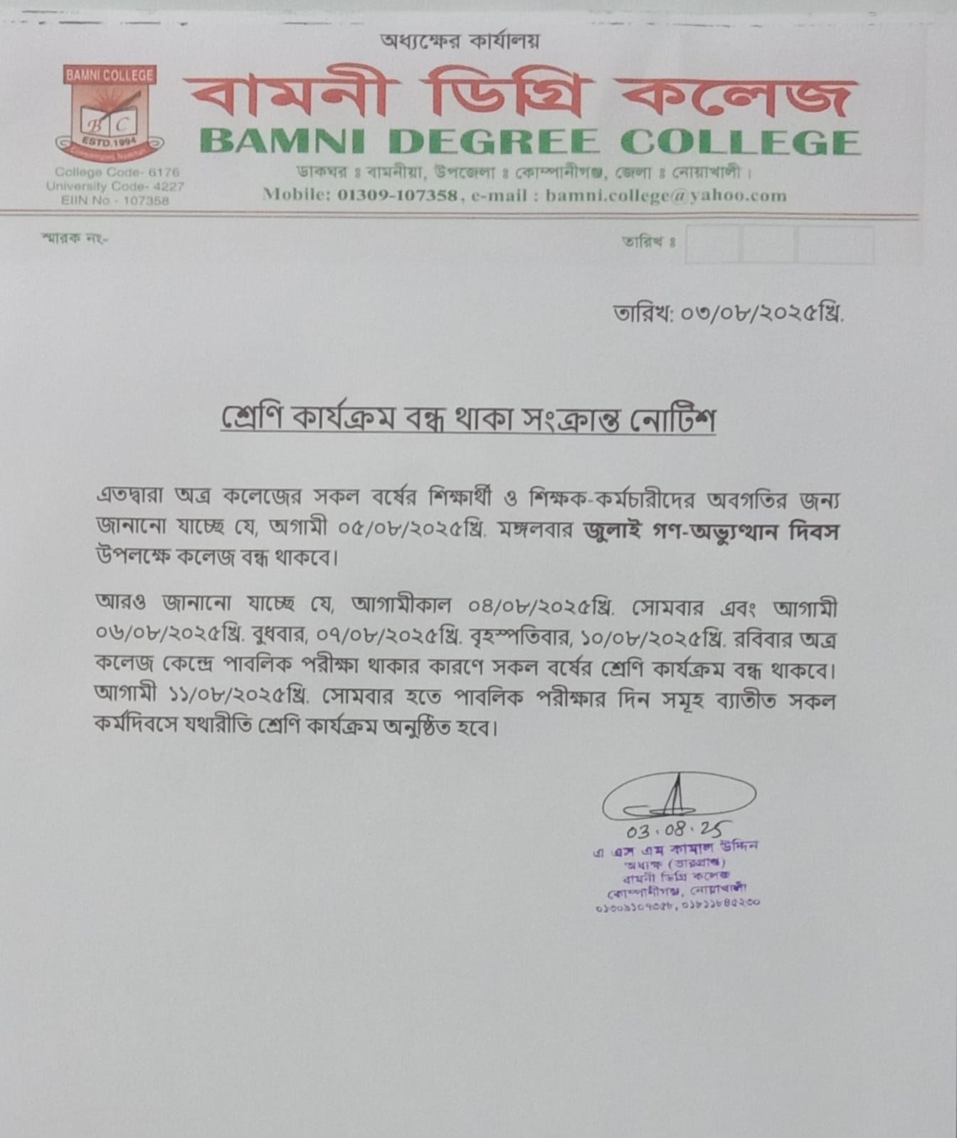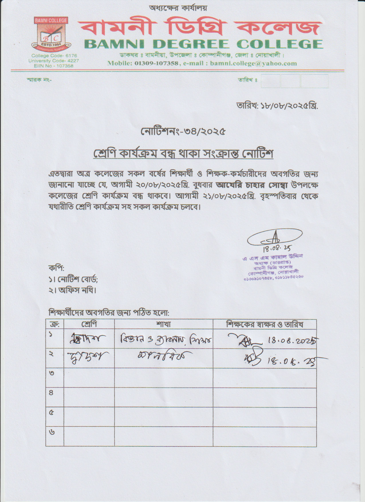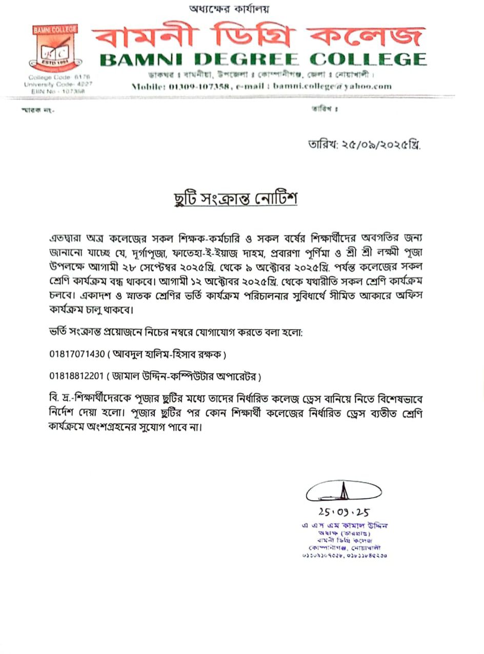 ২০/০৮/২০২৫খ্রি. বুধবার ‘আখেরি চাহার সোম্বা’ উপলক্ষে কলেজের শ্রেণি কার্যক্রম বন্ধ থাকবে |