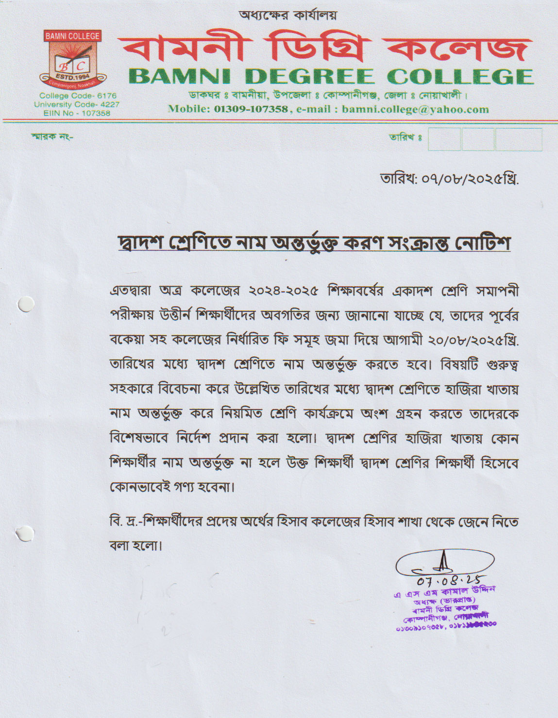 দ্বাদশ শ্রেণিতে নাম অন্তর্ভুক্ত করণ সংক্রান্ত নোটিশ |