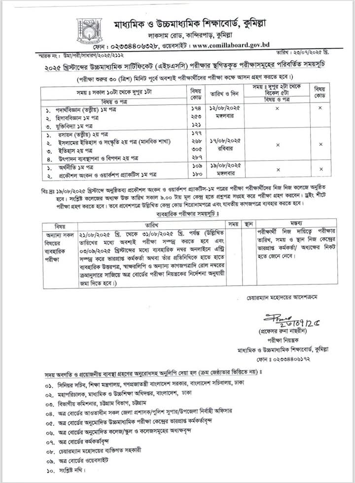 ২০২৫ খ্রিস্টাব্দের এইচএসসি পরীক্ষার স্থগিতকৃত পরীক্ষা সমূহের পরিবর্তিত সময়সূচী |